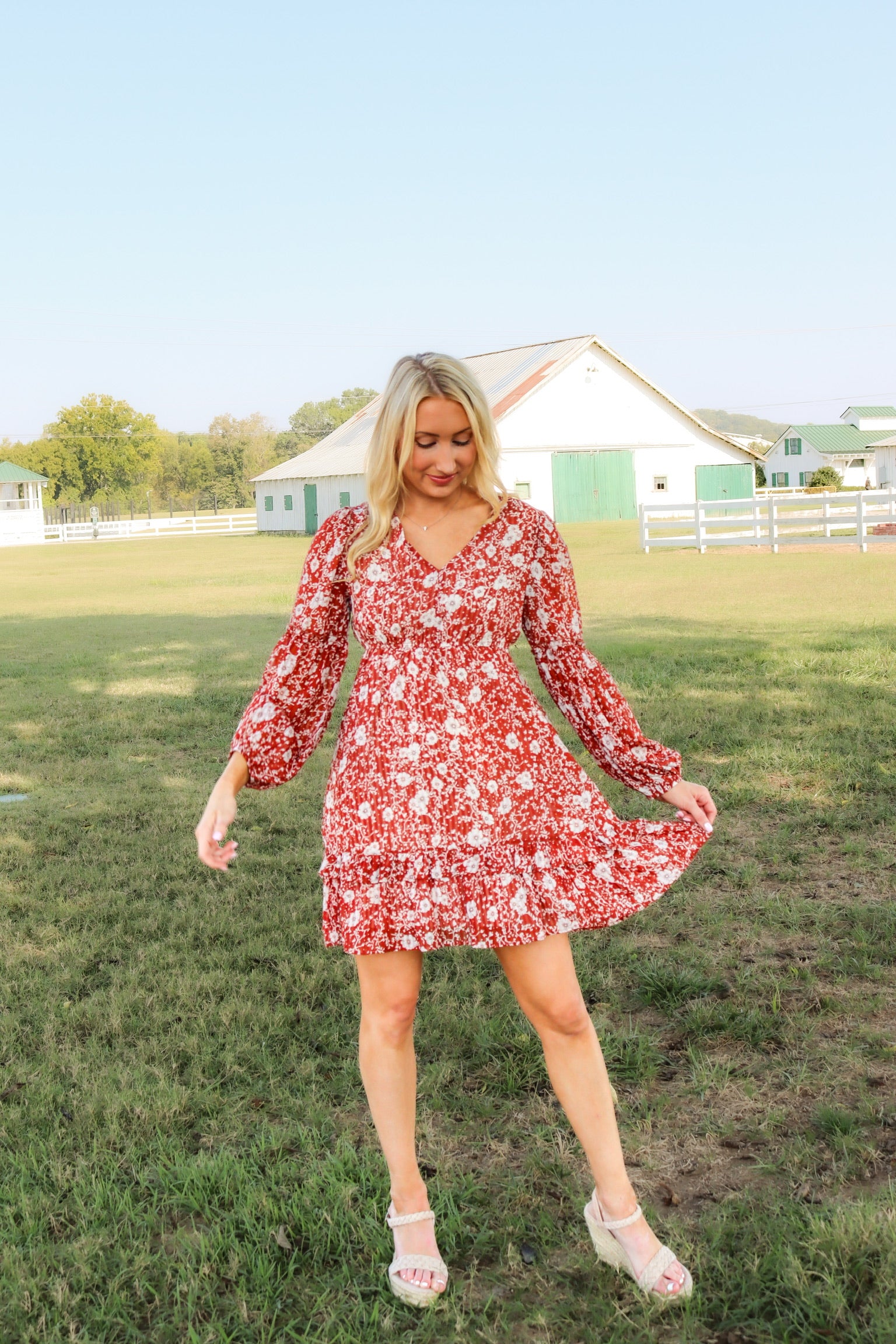Celebrate the season with the FALL-ing in love with you dress! Its rich brownish-red coloring & flirty floral print, sets the perfect autumn tone. With its long sleeves and flow material — this dress is ready to be your go-to outfit for any and all fall activities. Model is wearing a size small and fits true to size!