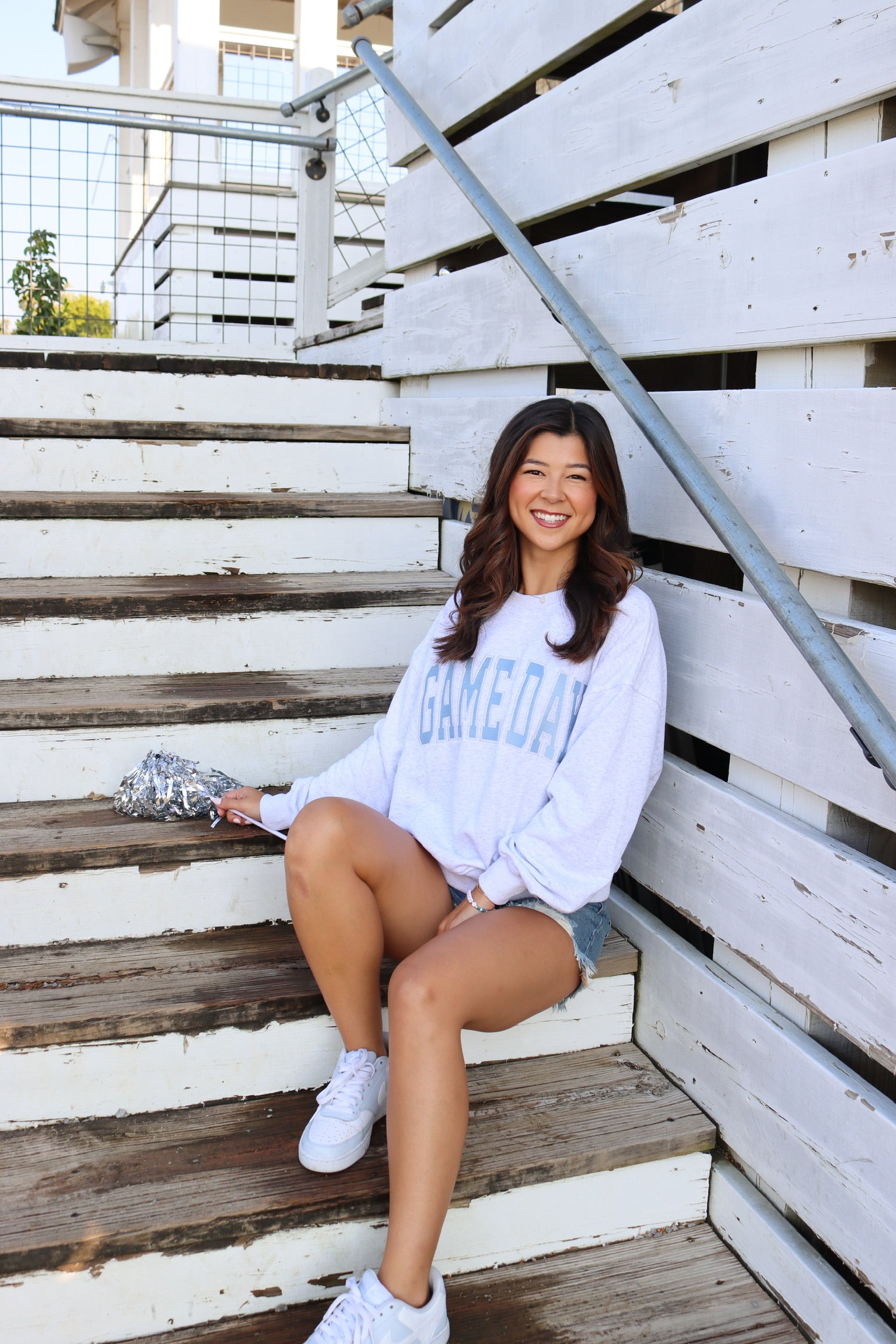 Show off your love for America and football with this adorable baby blue sweatshirt! The front has a sweet, simple design, but the back steals the show with a playful mix of an American flag, a bow, and a football. Perfect for those who want to stay cute and cozy on game day. The model is wearing a small for a great fit that’s both comfy and stylish.