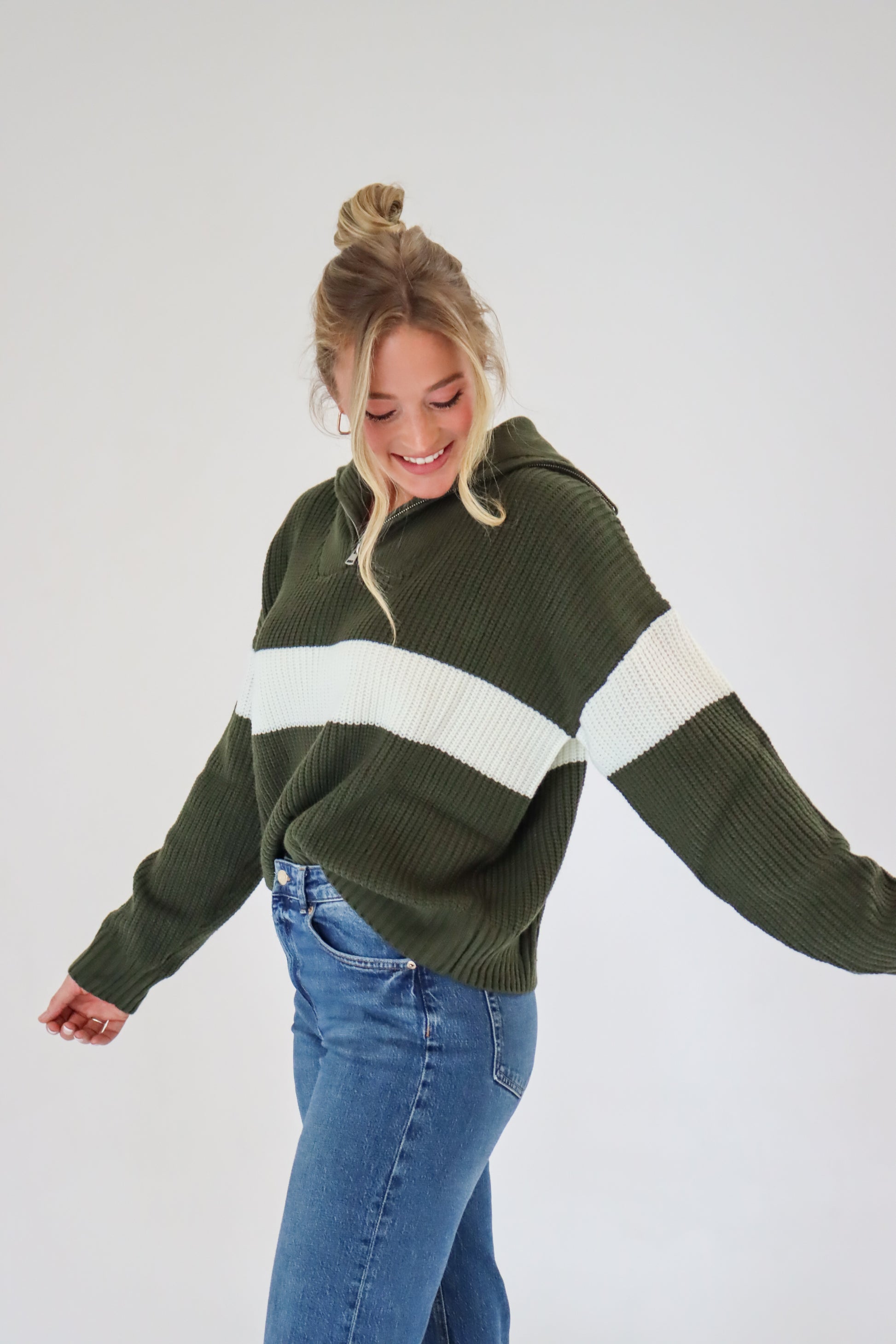 Elevate your sweater game with this fun and unique piece featuring a sleek straight hood and quarter zip design. Whether you're layering it over a dress for brunch or pairing it with your favorite jeans for a casual hangout, this versatile sweater works for any occasion. The relaxed fit makes it perfect for all-day comfort and model is wearing both small and medium.